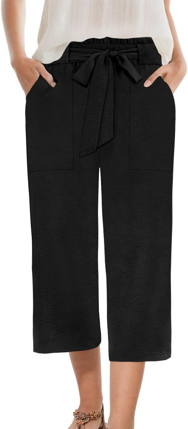Womens Wide Leg Capri Pants Summer High Waisted Pants Drawstring Casual Loose Trousers with Pockets