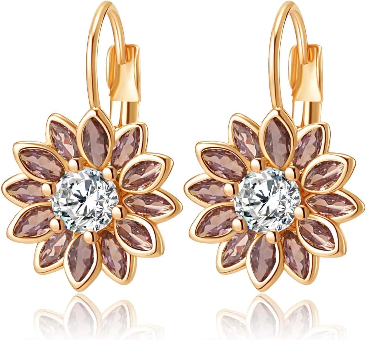 Austrian Crystal Flower Drop Leverback Earrings for Women Fashion 14K Gold Plated Hypoallergenic Jewelry