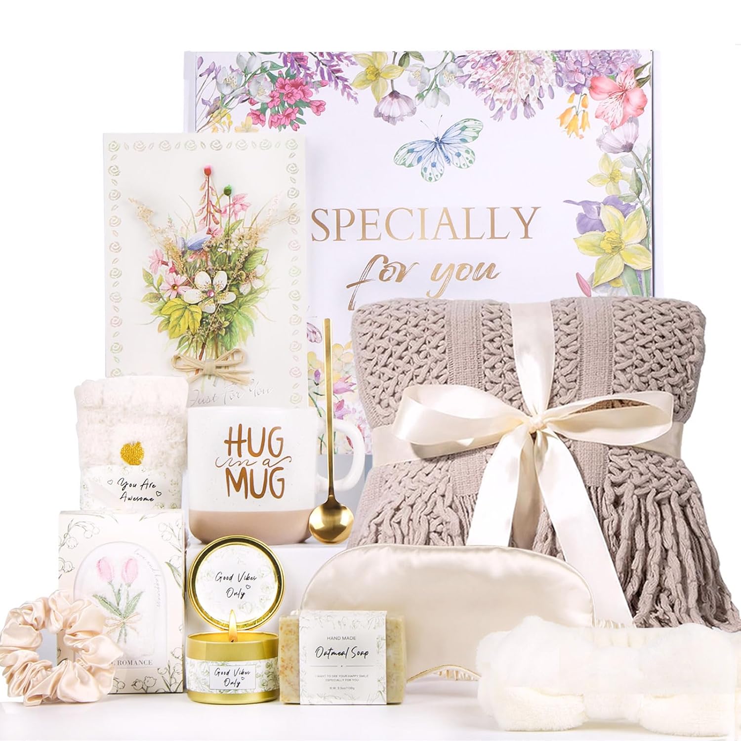 - 12PCS Self Care Gifts for Women : Self care gifts get well gifts happy birthday gifts for women contains luxurious items curated with love and care, including a 50x64in khaki knit fringed blanket, 12x12in white soft washcloth, 12oz ceramic mug with handle, Stainless steel metal spoon, 3.5oz floral and fruity scented candle, handmade oatmeal soap, fuzzy socks and headbands, silk eye mask and hair scrunchie, beautiful gift card and gift box. Absolutely the best friend birthday gifts for women, thinking of you gifts for women, spa gifts for women, friendship gifts for women
