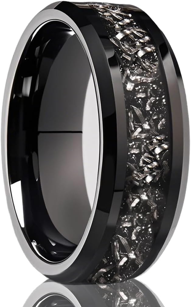 Black Tungsten Carbide Rings for Men and Women 8mm Flat Inlaid Meteorite Fragments Men's Engagement Wedding Bands High Polished Comfortable Wear