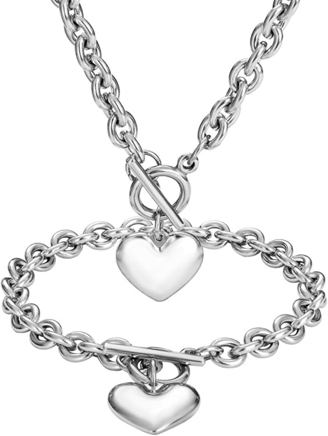 LionWay 6mm Silver & Gold Heart Pendant Necklace & Bracelet Set – 18" Necklace & 8" Bracelet with Toggle Clasp, Dainty Jewelry Gift for Women