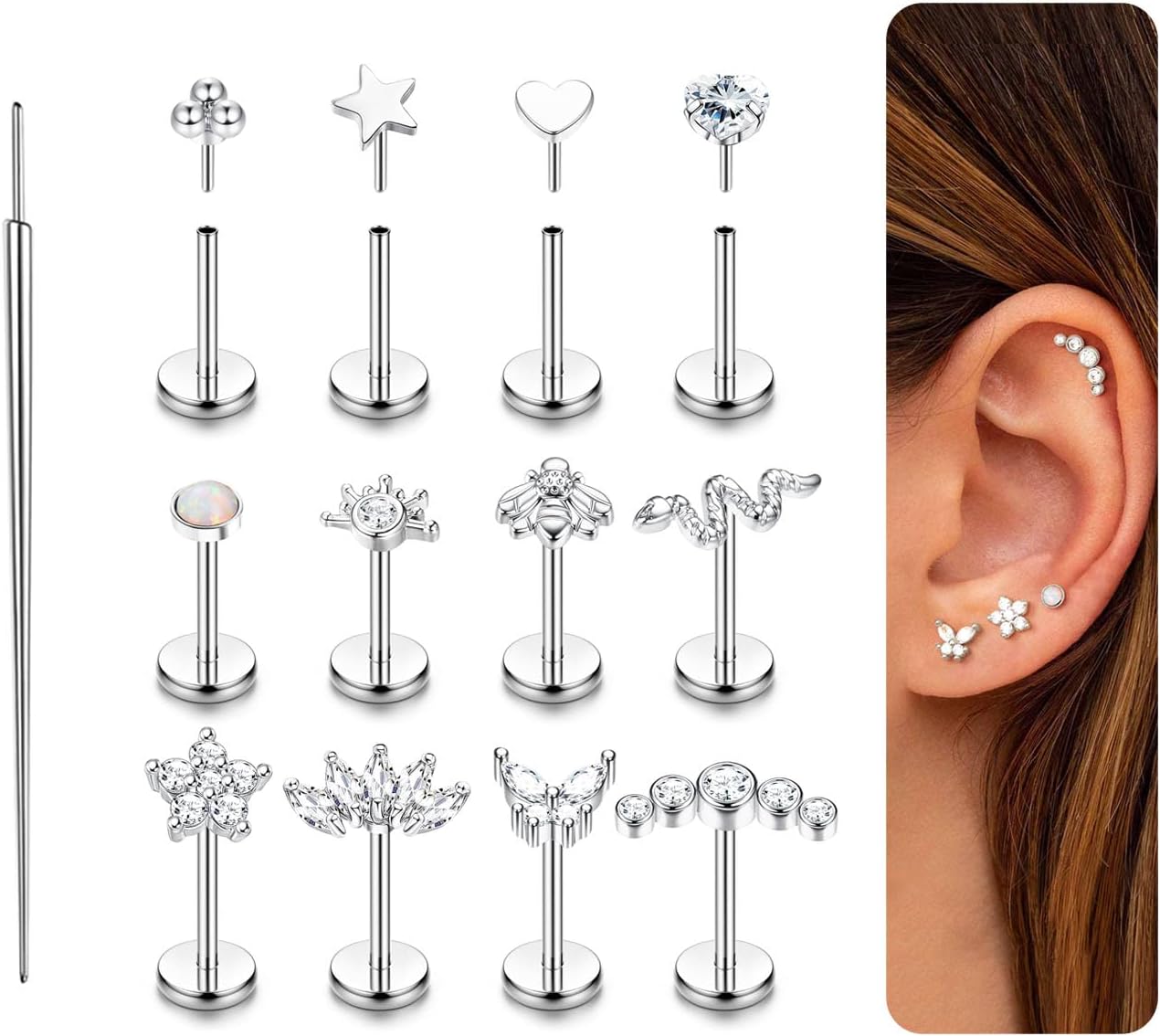 ORAZIO 14K Gold Plated Push in Stud Earrings, 316L Surgical Steel Flat Back Earrings Threadless Tragus Helix Cartilage Conch Nose Piercing Jewelry Hypoallergenic Ear Piercing for Women 20G 18G 16G
