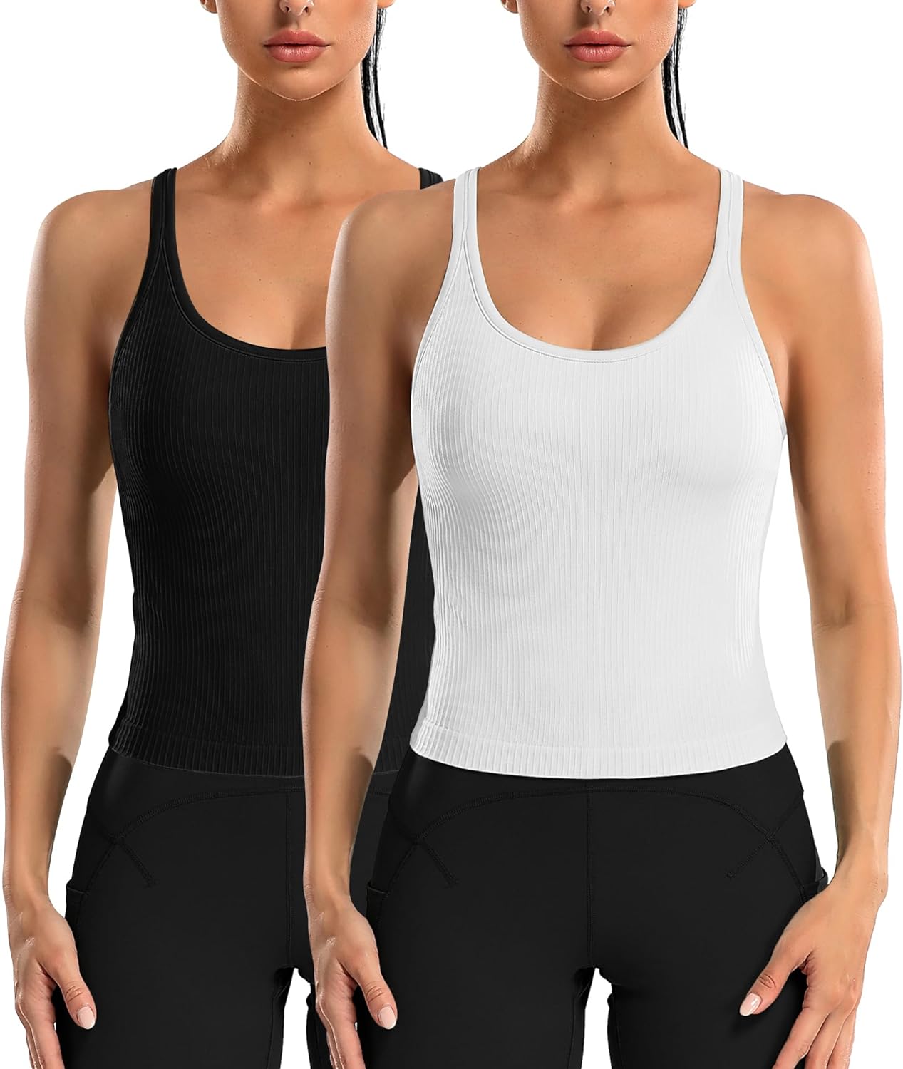 ATTRACO 2 Pack Ribbed Workout Tank Top with Built in Bra Women Seamless Cropped Racerback Yoga Tops Tight Fit