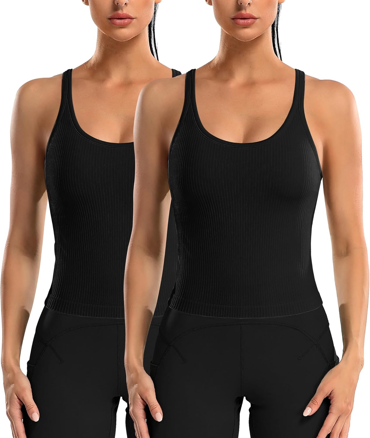 ATTRACO 2 Pack Ribbed Workout Tank Top with Built in Bra Women Seamless Cropped Racerback Yoga Tops Tight Fit