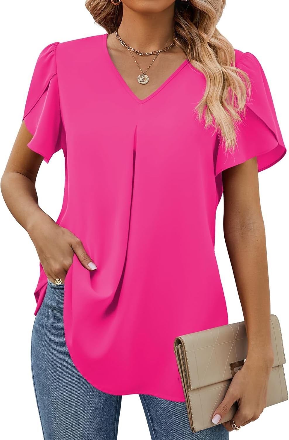 Funlingo Women's Summer Tops Short Sleeve Dressy Chiffon Blouses V Neck Work Tunic Tops Casual Loose T-Shirts