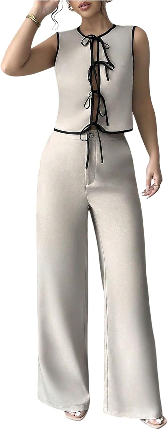 OYOANGLE Women's Two Piece Dressy Outfit Tie Up Tank Top Zipper Fly Wide Leg Pants Matching Sets