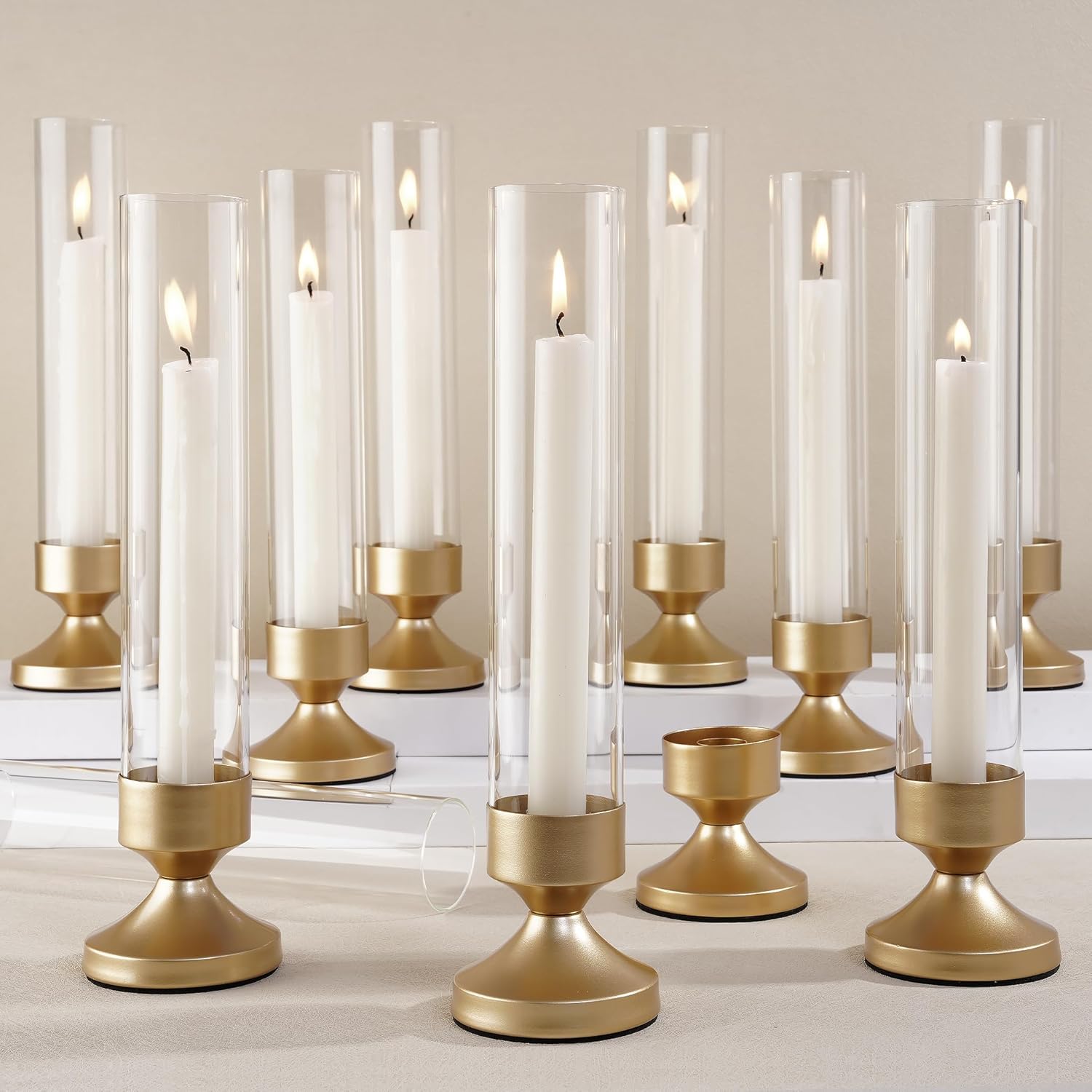 Hurricane Glass Candle Holders, Set of 10 Metal Taper Candlesrick Holders for Centerpieces Tall Gold Candle Stands Bulk with Glass Cylinder for Wedding Birthday Party Table Decor