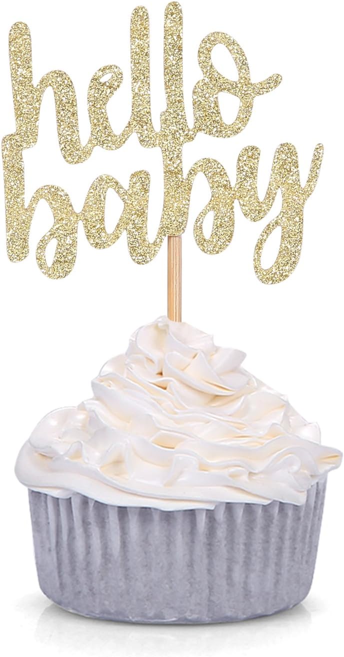 24 CT Gold Glitter Hello Baby Cupcake Toppers Baby Shower Party Decors