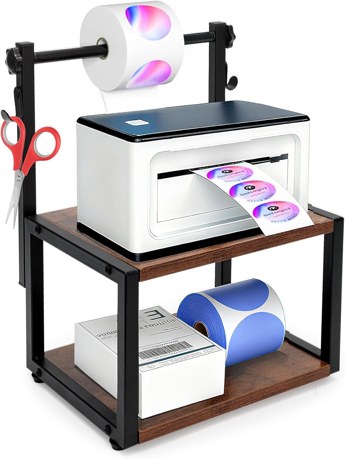 - Multiple-use Sticker Holder: GHWMYD Upgrade desktop stand has two-tier wooden shelves for placing your thermal printer and storing roll labels, fan-fold labels, and other office accessories can be hung on the hooks beside, maximizing workspace efficiency and tidiness