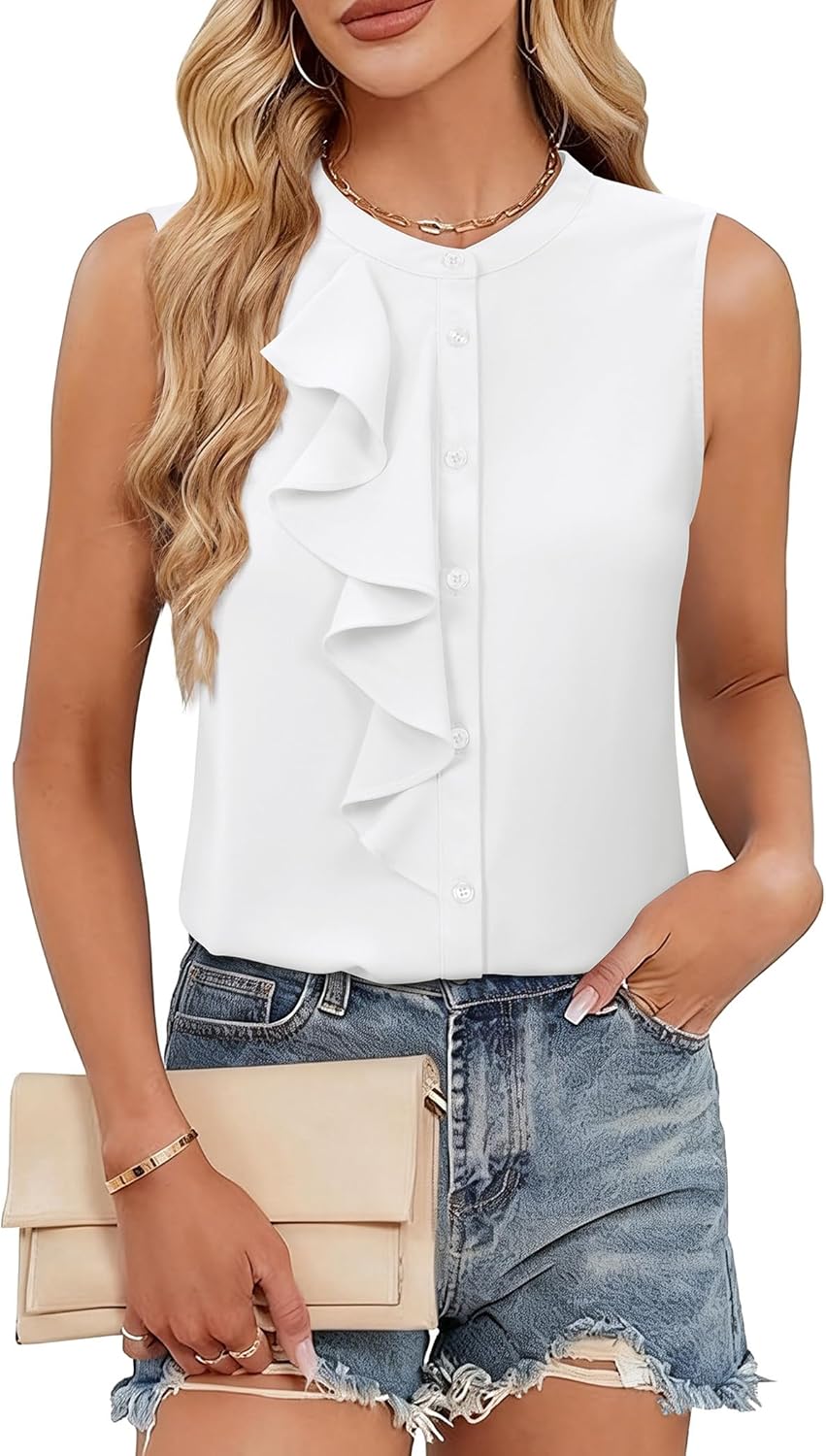 siliteelon Womens Dressy Casual Blouses: Round Neck Button Down Ruffle Sleeveless Casual Business 2026 Spring Ladies Tops