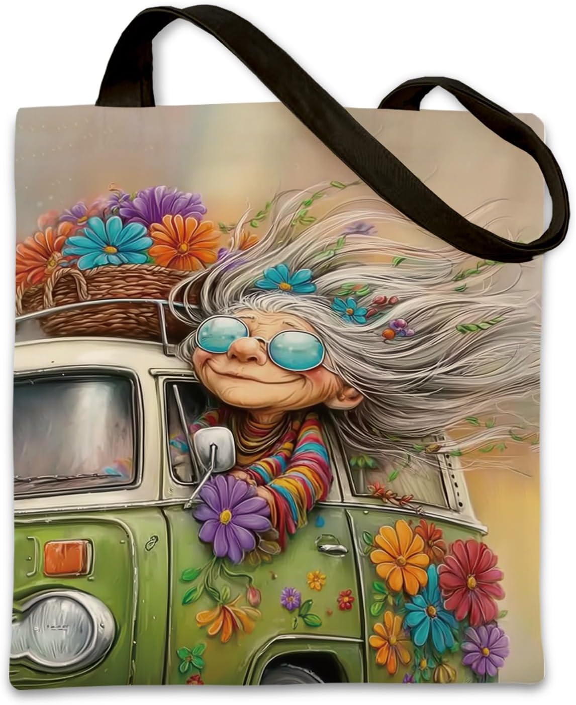 Funny Grandma Trip Tote Bag, Hippie Van Flower Power Canvas Bag, Two Sided Print Reusable Grocery Bags, Aesthetic Boho Shoulder Bags for Women, Retro Travel Gift Tote