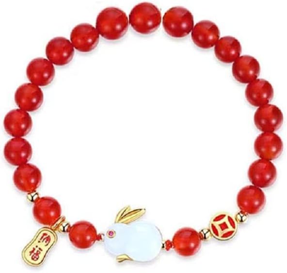 COLORFUL BLING Lucky 2023 New Year of The Rabbit Natural Stone Strand Stretch Bracelet Handmade Crystal Jade Healing Chinese Zodiac Good Luck Amule Animal Bunny for Women Men New Year Jewelry-A