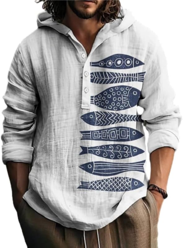 Men’s Hooded Linen Henley Shirt – Artistic Boho Print Long Sleeve Casual Top for Beach, Travel, and Everyday Wear