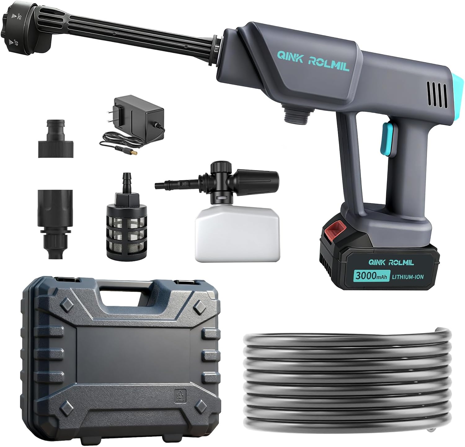 - All-in-One Portable Cleaning Kit Your QINK ROLMIL portable power washer kit includes everything: the gun, battery, charger, 16ft hose, 6-in-1 nozzle, and foam cannon. It's a comprehensive cordless power washer solution that arrives ready-to-use