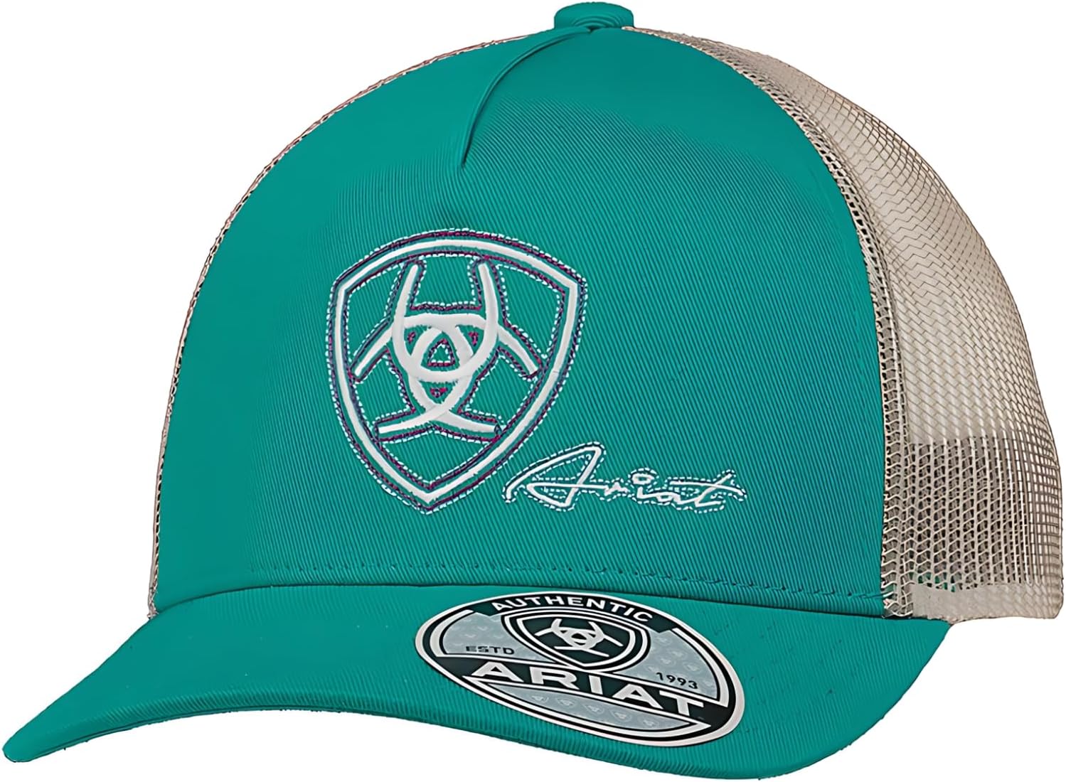 Ariat Women's Embroidered Logo Snapback Cap with Turquoise Front and Cream Mesh Back