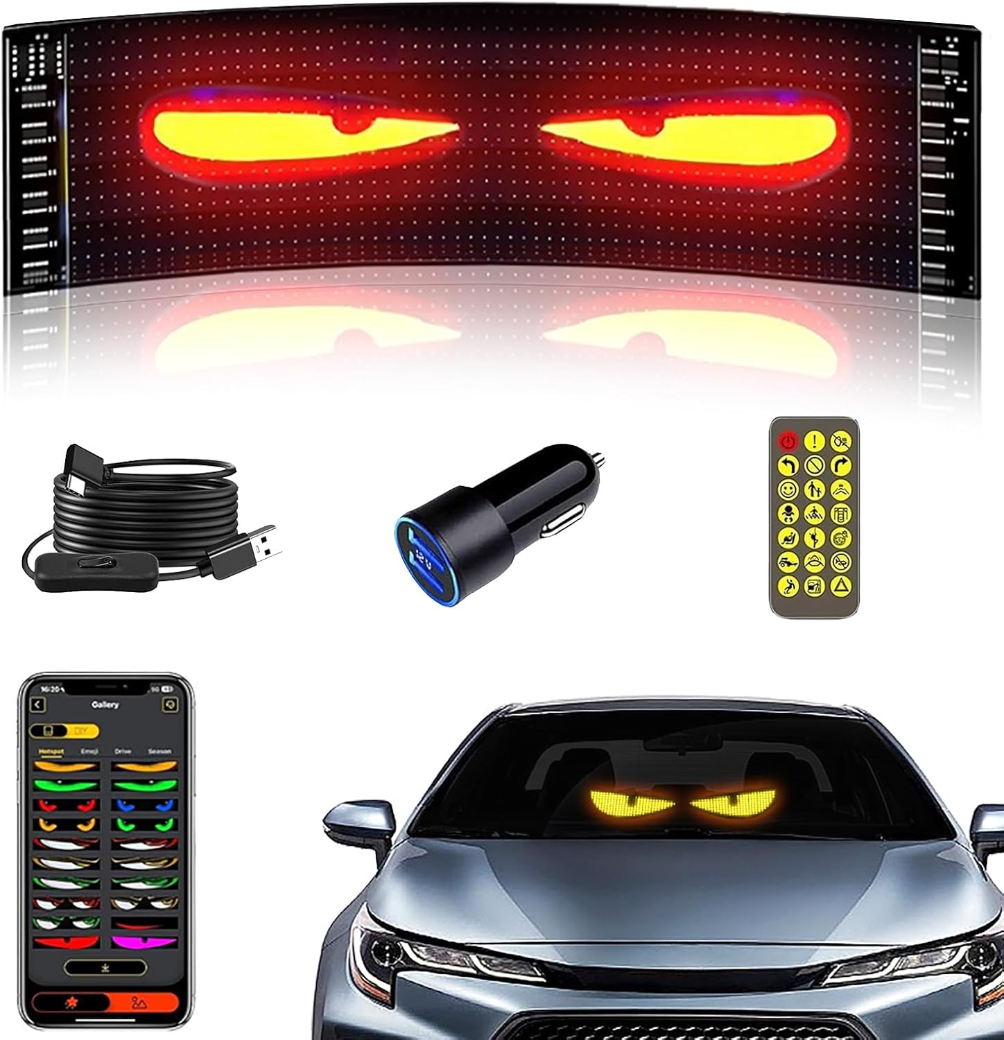 Flexible Devil Eyes Light for Windshield,LED Sign for Car,LED Digital Panel with Animations, Remote Control & Bluetooth APP for Cars,SUVs,Trucks(14.6'' * 3.6'')