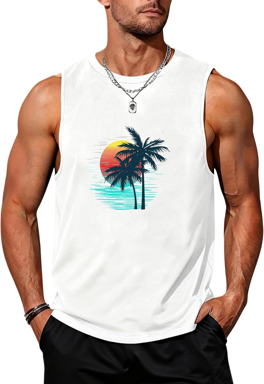 Mens Beach Tank Tops Summer Hawaii Vacation Graphic Muscle Palm Tree Sleeveless Shirts