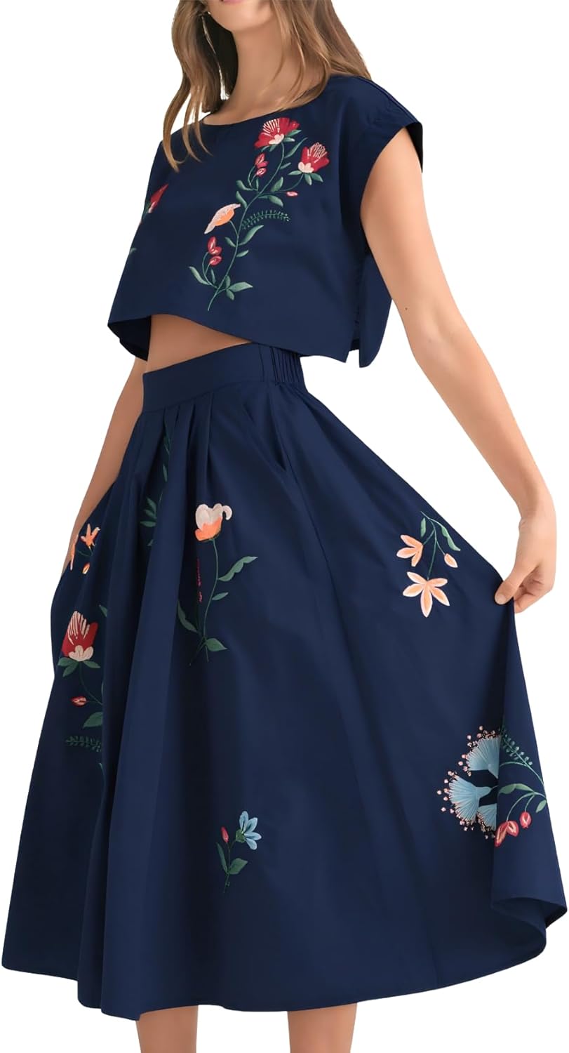 Women Floral Embroidery Dress Sleeveless 2 Piece Tank Top and Skirt Loose Fit Boho Dress
