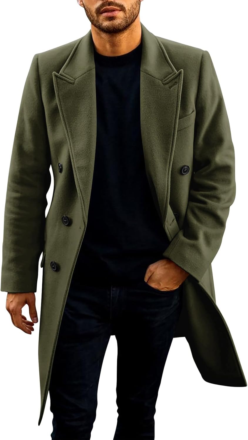 PASLTER Mens Trench Coat Mid Long Double Breasted Slim Fit Peacoat Notched Lapel Winter Business Overcoat
