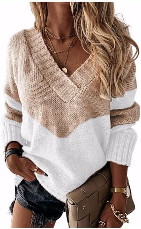 Bengbobar Womens Leopard Print Sweater V Neck Sweaters Knit Long Sleeve Jumper Sweater Color Block Ribbed Pullover for Women