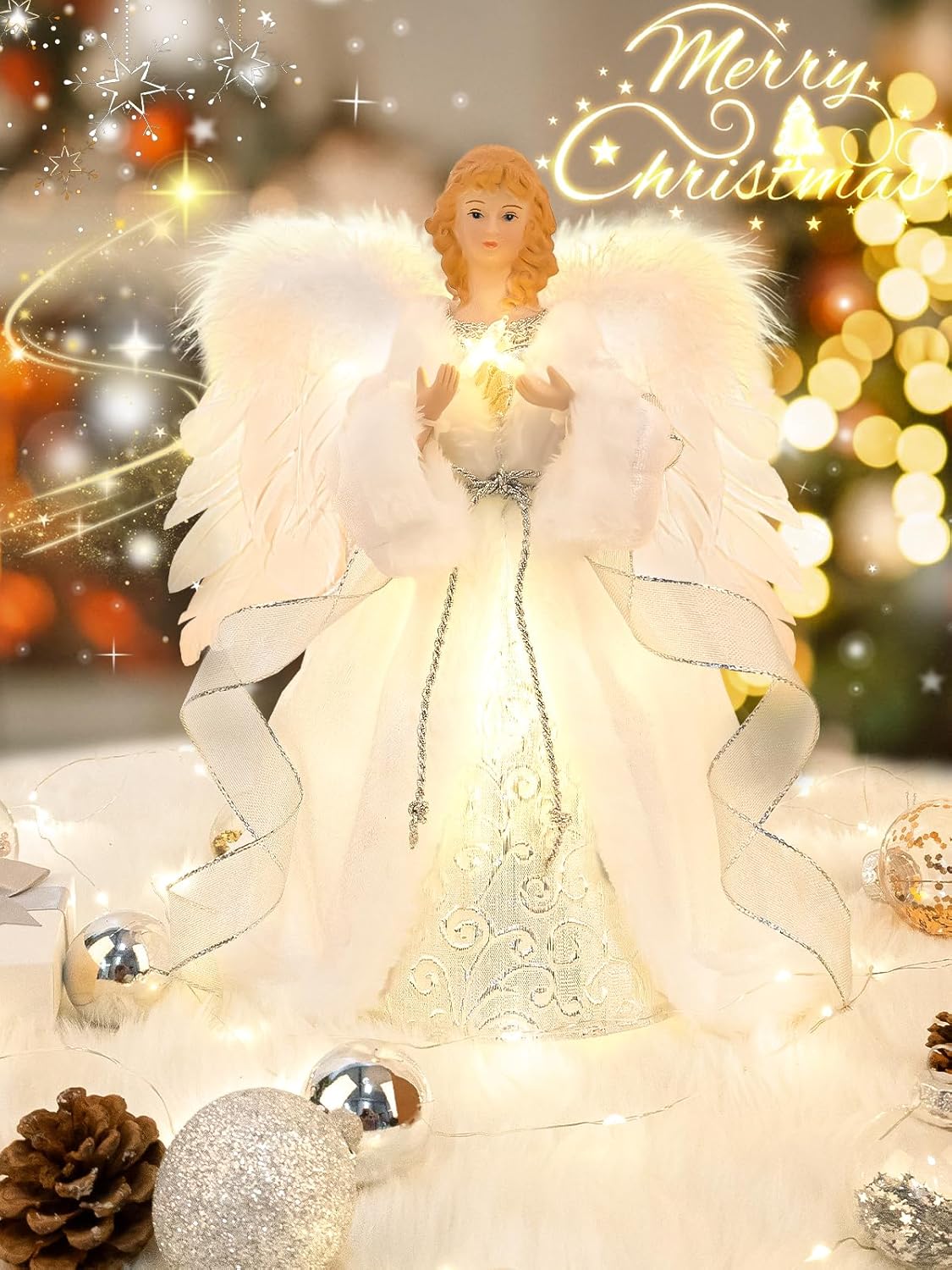 - Perfect Decoration:This angel fits our small tree (3-5ft Christmas tree) perfectly and it just looks so beautiful. suitable for home decor, eg: tabletop, desk, corner, also a nice gifts to kids for Christmas or new year.It is a ideal for Christmas treetop ornament, mantelpieces decor, windowsill decoration. He will add a touch of Christmas luxury to any home and suits all ages.
