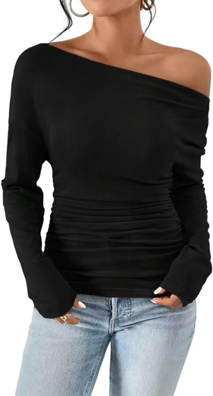 VKEGNIO Women's Off Shoulder Tops Fashion Long Sleeve Shirts Boat Neck Casual Pullover Tunic Tops Blouses