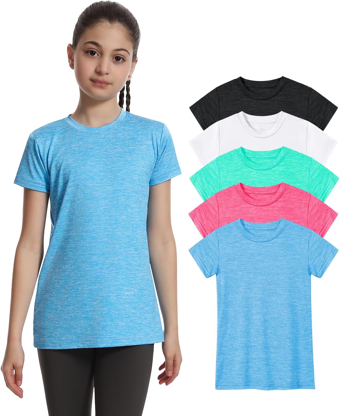 5 Pack Girls Athletic Shirts Short Sleeve Dry Fit Sports T-Shirts Crew Neck Activewear Tees Tops for Kids Teens