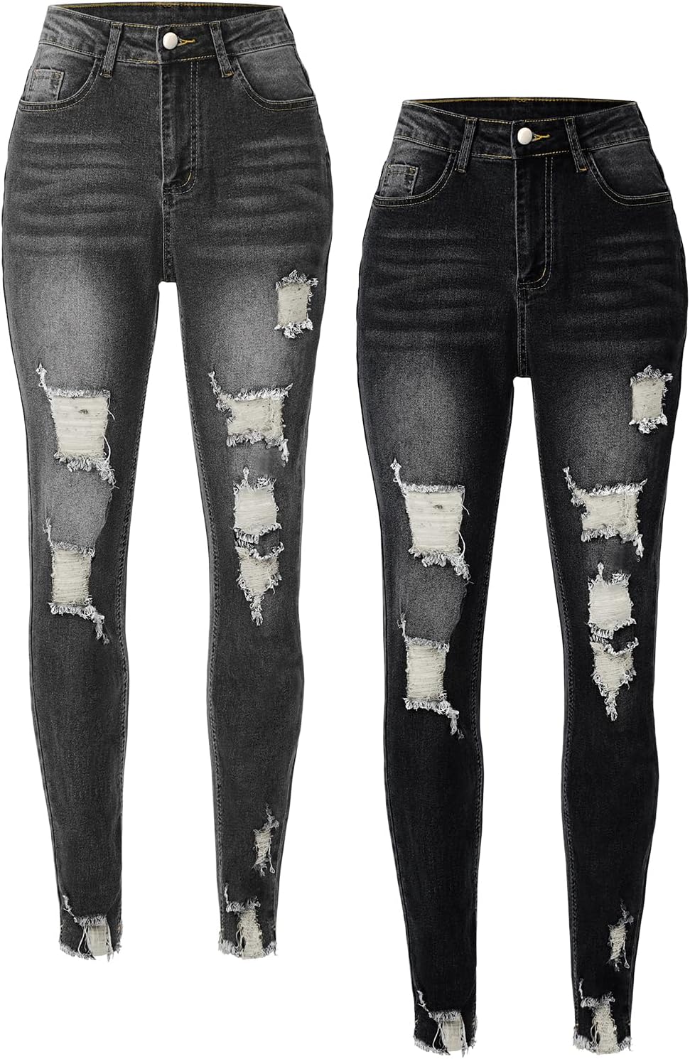 Women's Jeans Butt Lift Comfy Stretchy Ripped Skinny Mid Waist Destroyed Denim Pants (Pack of 2)