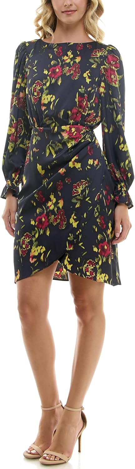 Nicole Miller Women's Long Sleeved Elastic Ruffle Cuff Satin Dress, Deep Navy Print, 10