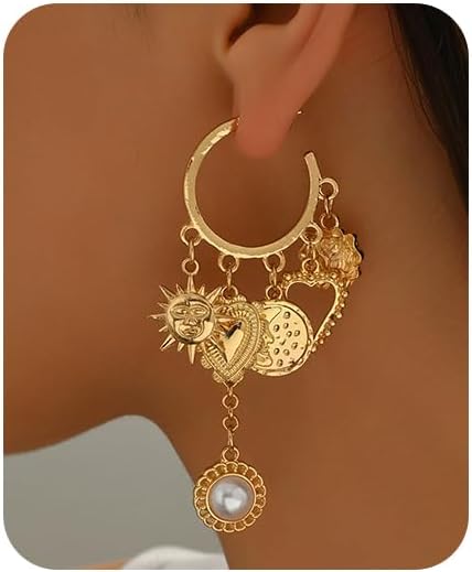 Boho Dangle Hoop Earrings for Women Trendy Bohemian Peal Charm Earring Gold Plated Heart Drop Statement Jewelry Gift