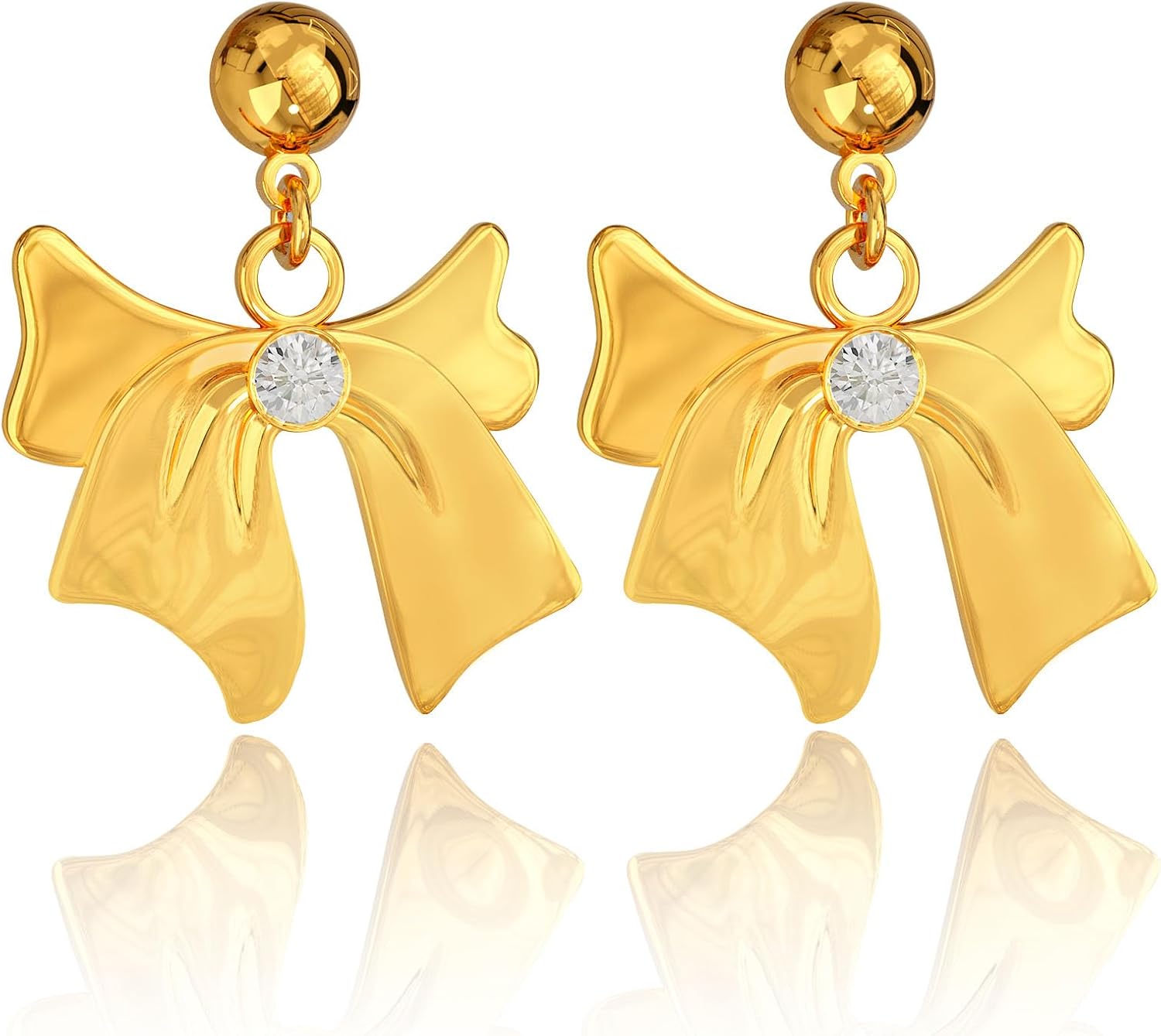 14K Gold Drop Earrings for Women - Hypoallergenic 925 Sterling Silver Posts Bow Dangle Earring Cubic Zirconia Jewelry Gifts for Birthday Anniversary