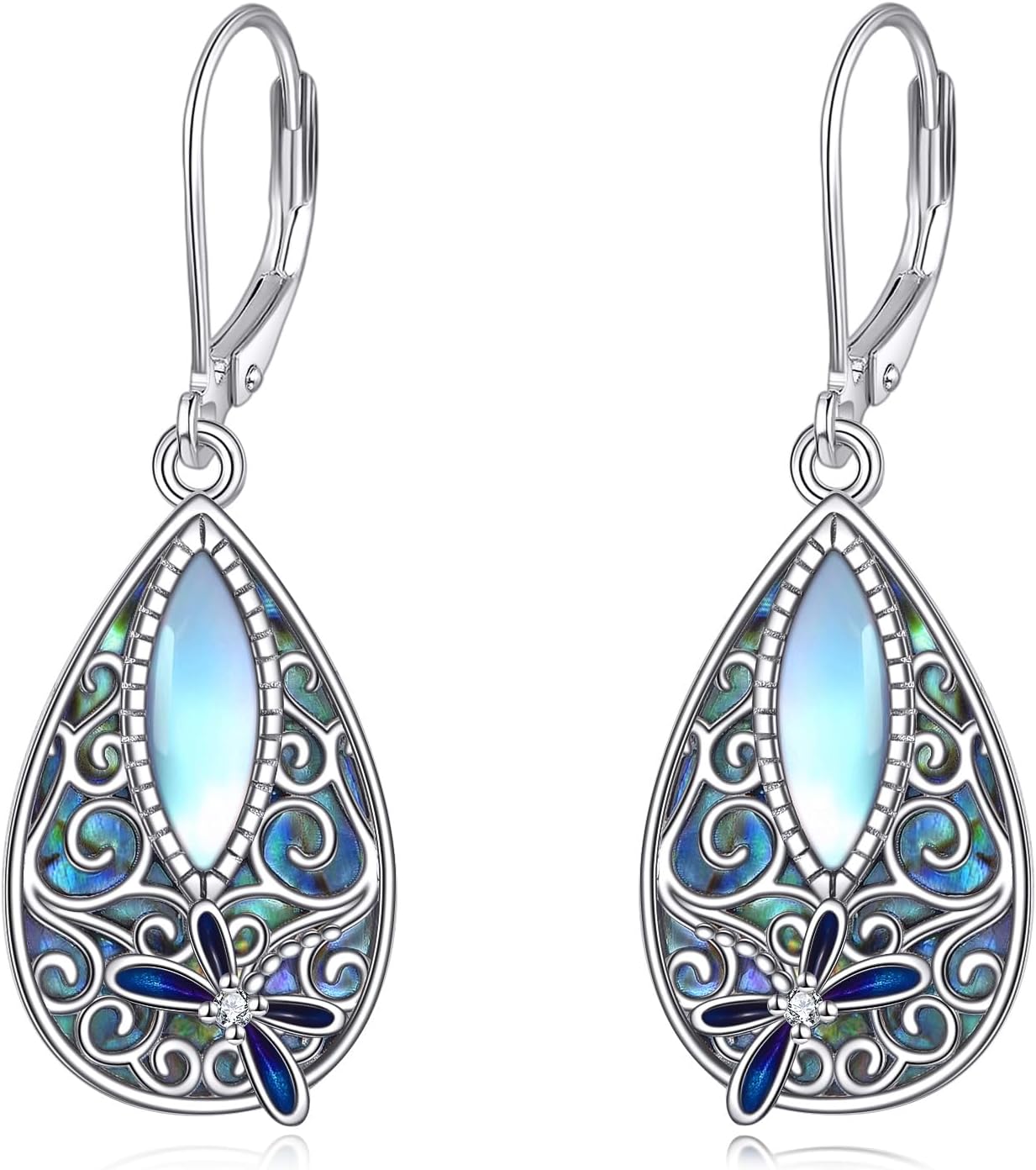 MONGAS Dragonfly Filigree Earrings Sterling Silver Moonstone Teardrop Abalone Drop Dangle Earrings Filigree Leverback Dragonfly Jewelry Gifts for Women