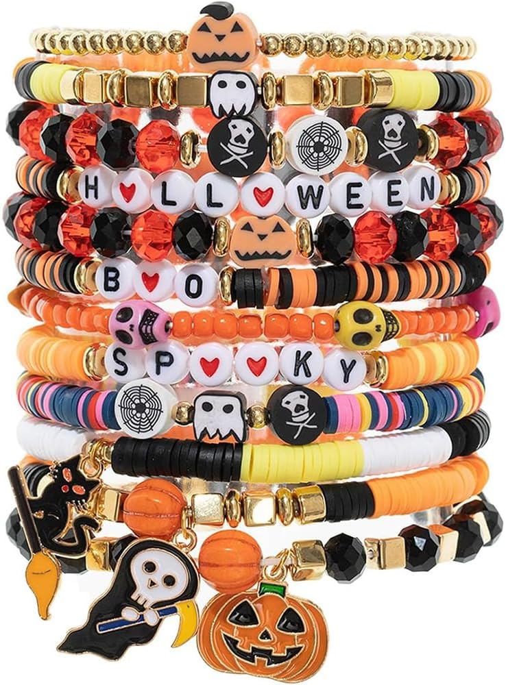 Halloween Pumpkin Beaded Bracelet Stackable Layered Ghost Cat Skull Bat Stretch Bracelet Elastic Colorful Heishi Clay Bead Bracelets Charms for Women Jewelry