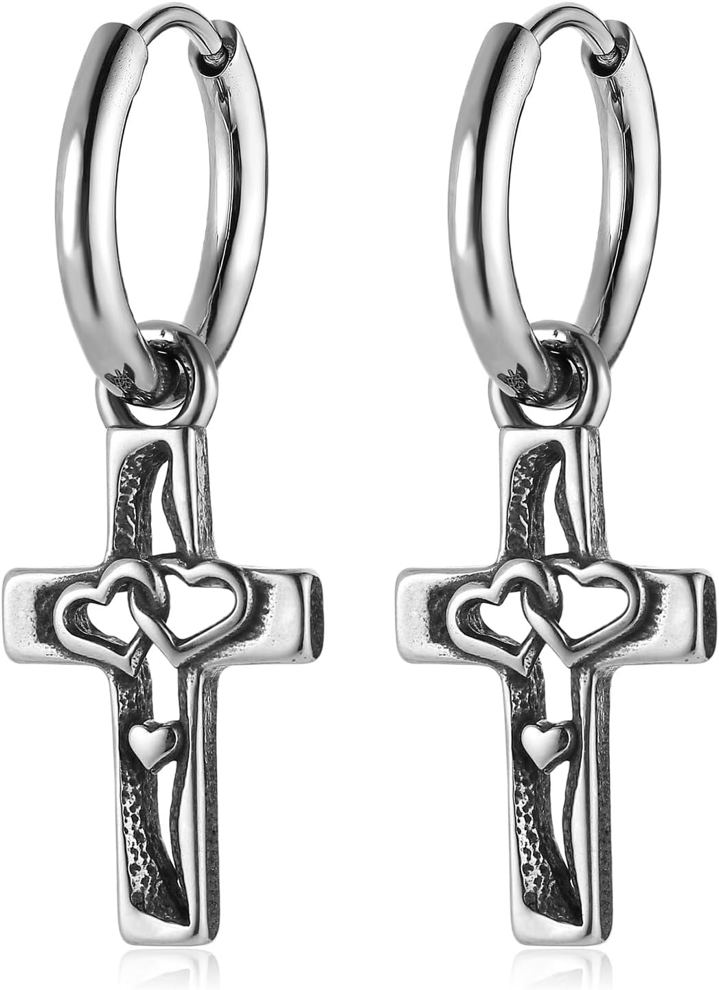 HZMAN Stainless Steel Huggie Hoop Earrings for Women Retro Love Heart Cross Drop Dangle Earrings