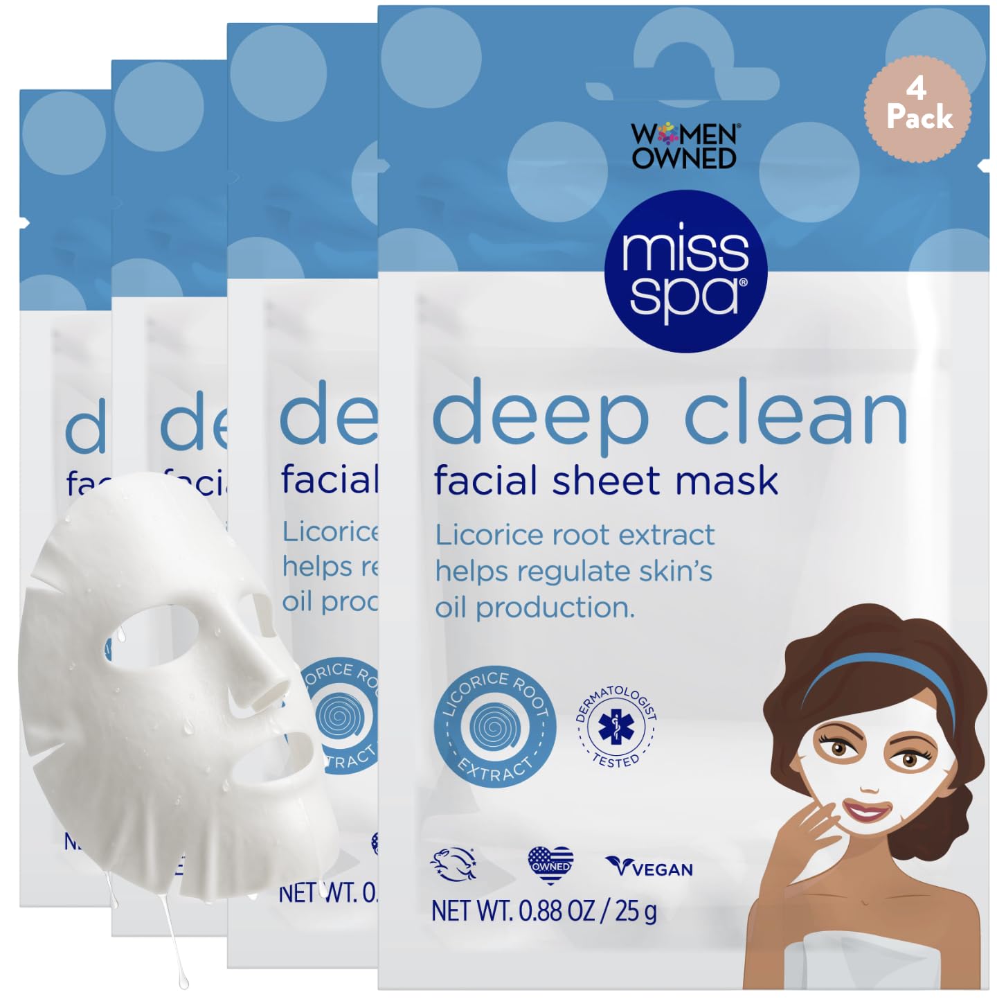 MISS SPA Deep Clean Facial Sheet Mask with Licorice Root Extract Oil Control Clearer Skin for Oily Combination Skin Vegan, Cruelty-Free, Dermatologist Tested 4 Pack