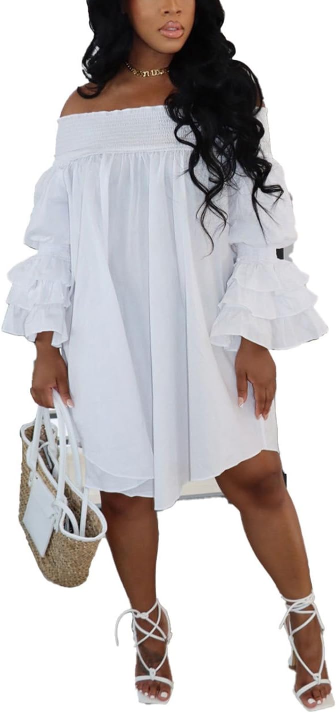 Off The Shoulder Dresses for Women Ruffle Sleeve Summer A-Line Pleated Midi Dress Plus Size