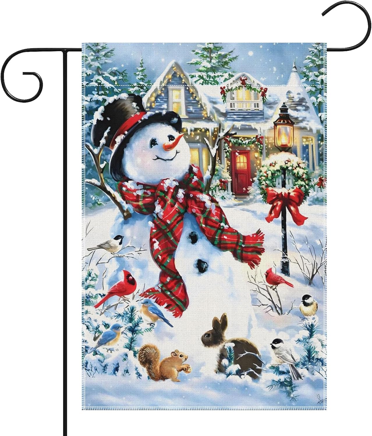 - Whimsical Winter Scene– Features a snowman with a red plaid scarf surrounded by a bunny, birds, and squirrel in a snowy woodland setting, bringing cozy charm to your outdoor space.