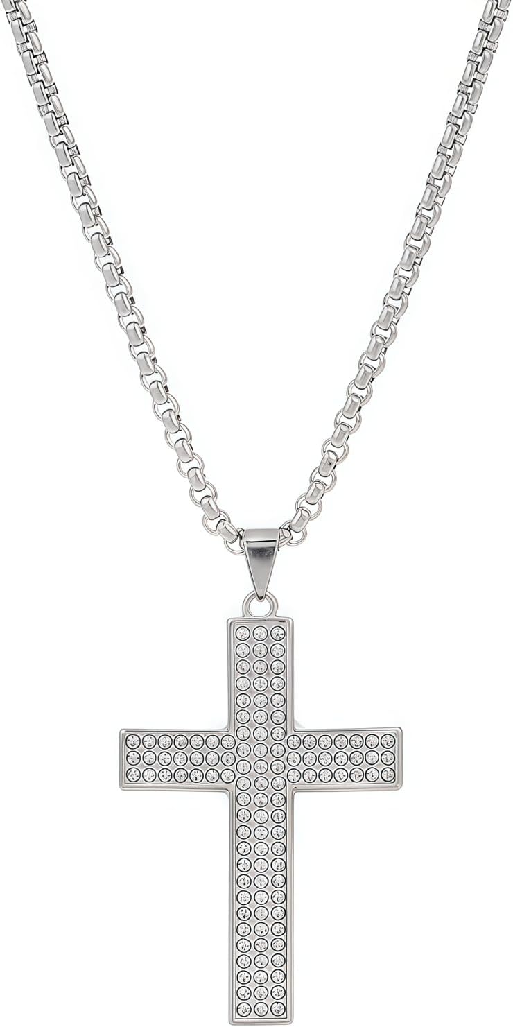Cross Necklace for Men Women Silver Hip-Hop Statement Stainless Steel Rope Chian Cubic Zirconia Cross Pendant Necklace Christmas Party Jewelry Gifts