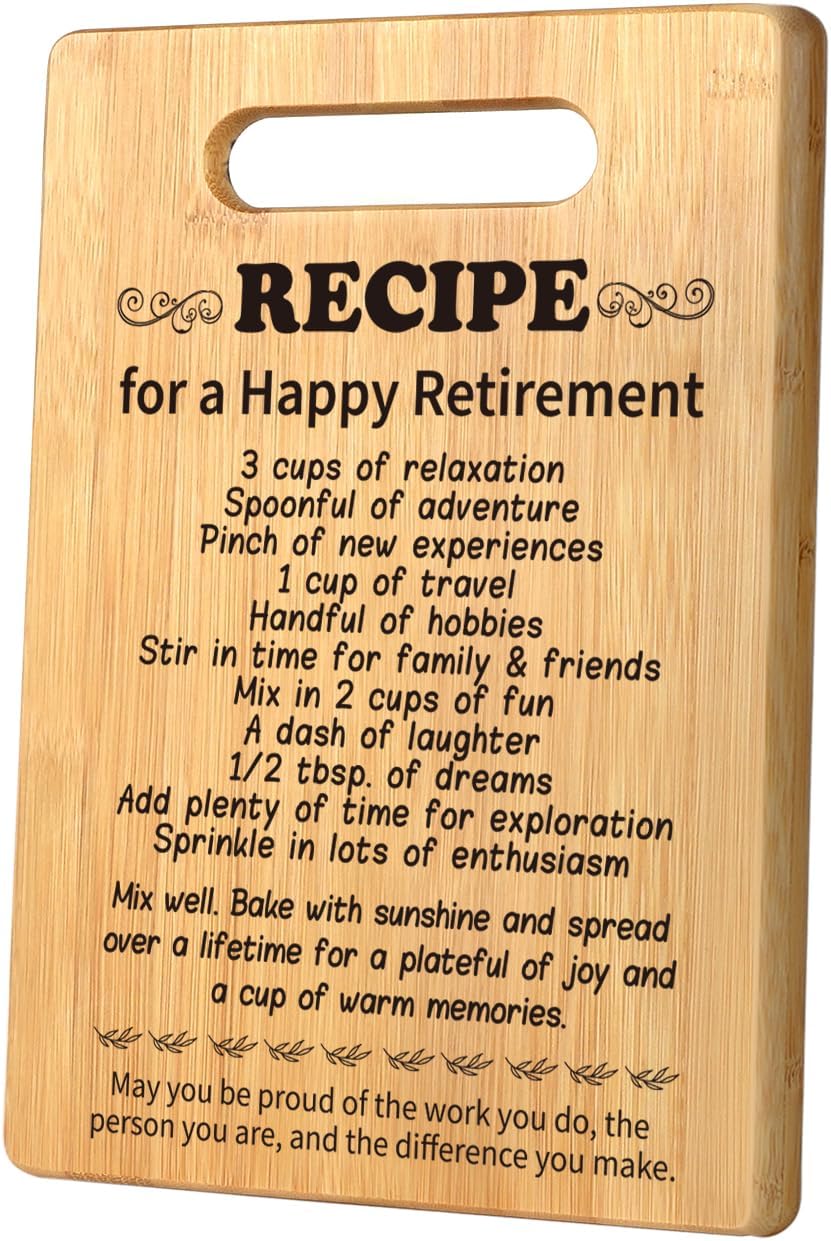 - Gifts for Retired Women: It measures 11.8”L x 7.7”W x 0.5”H. The carefully crafted cutting boards are both beautiful and functional, and can be displayed in the kitchen as an excellent decorative piece or used on a daily basis. Every time someone look at the cutting board you sent while cooking, she will feel your love through the warm words on the cutting board.