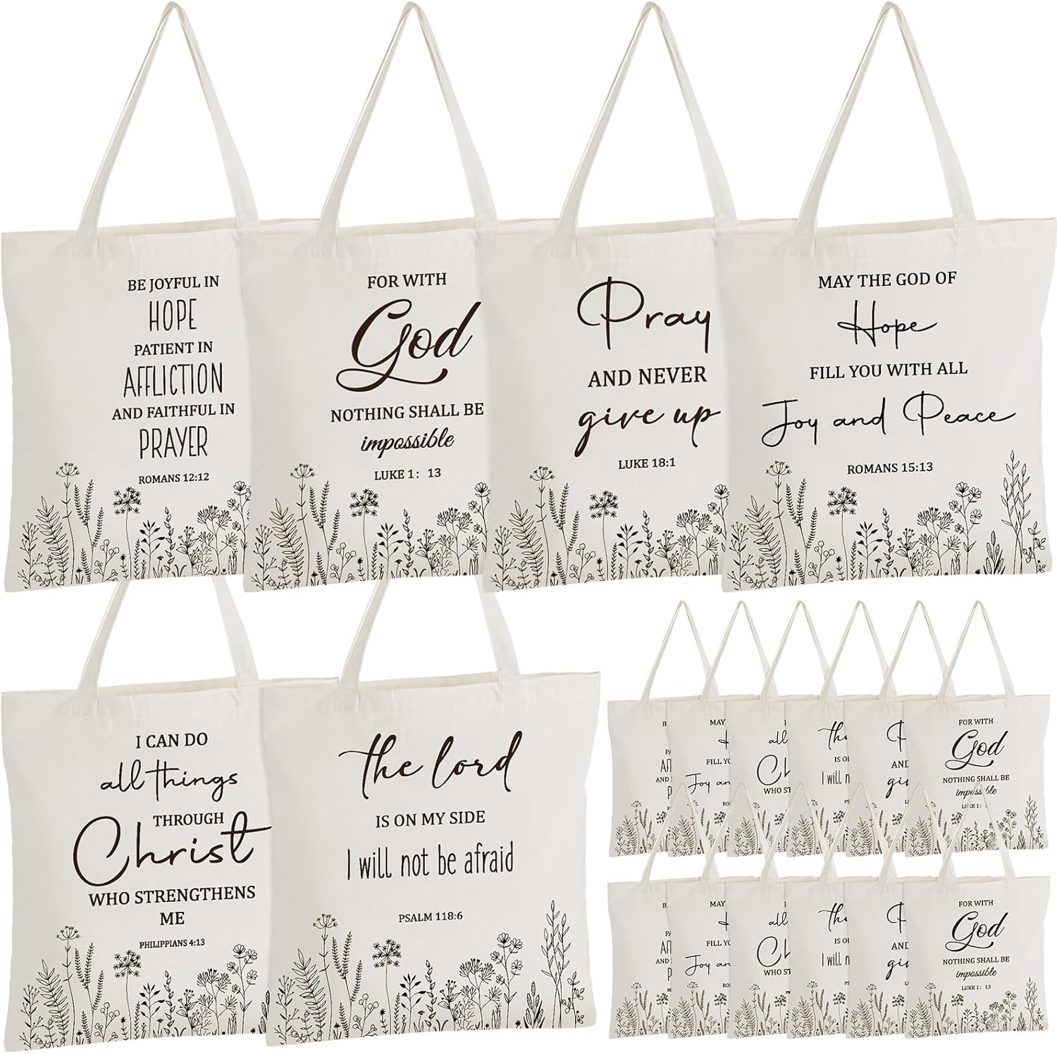 Aliceset 12 Pcs Bible Tote Bags Bulk for Women Christian Religious Bible Verse Canvas Reusable Church Floral Jesus Bags for Church Gifts, 15 x 16 Inches