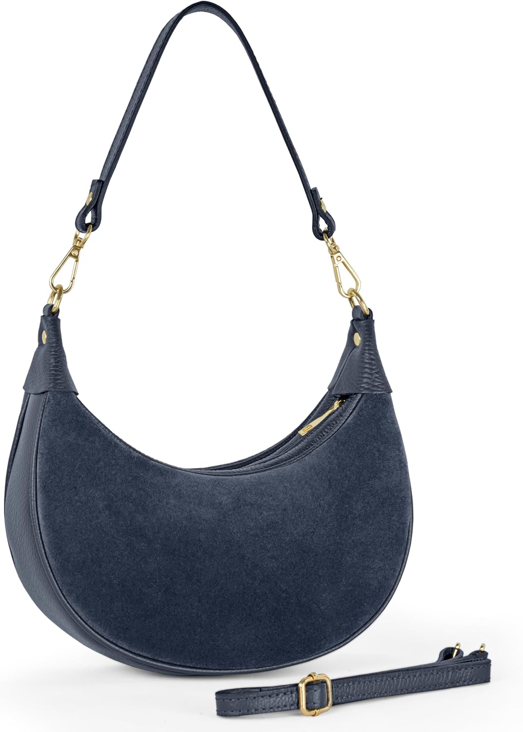 Italian Genuine Suede Shoulder Bag for Women, Crescent Saddle Style with Short & Long Straps | Mixed Leather Purse