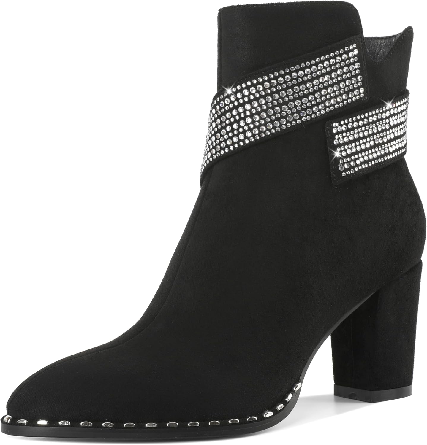 Zamikoo Chunky Heel Ankle Boots for Women Round Toe Beaded Heel Short Booties Fall Heel Boots with Sparkly Rhinestone Strap Side Zipper 3 Inches