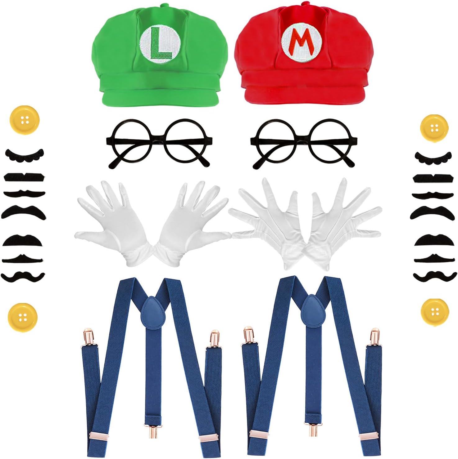 Super Bros Costume Kit with Hat, Mustaches, Suspenders, Gloves Buttons ang Glasses frame for Halloween, Cosplay and Christmas