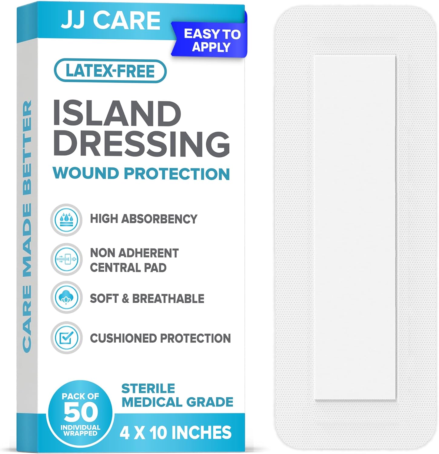 ![JJ CARE Adhesive Island Dressing [Pack of 50], 4” x 10” Sterile Bordered Gauze, Breathable Island Wound Dressing, Individually Wrapped Adhesive Gauze Bandages with Non-Stick Central Pad - Image 5](https://m.media-amazon.com/images/I/81xHfpHQkAL._AC_SL1500_.jpg)