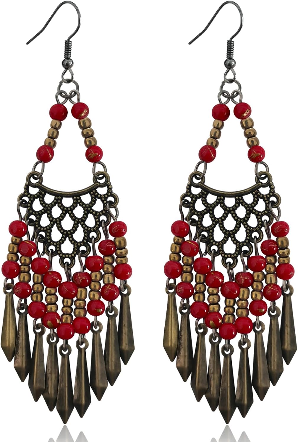Handmade Vintage Bronze Bohemian Long Tassel Colorful Bead Dangle Drop Earrings Big Tribal Chandelier Geometry Hook Earrings for Women Statement Jewelry Gifts