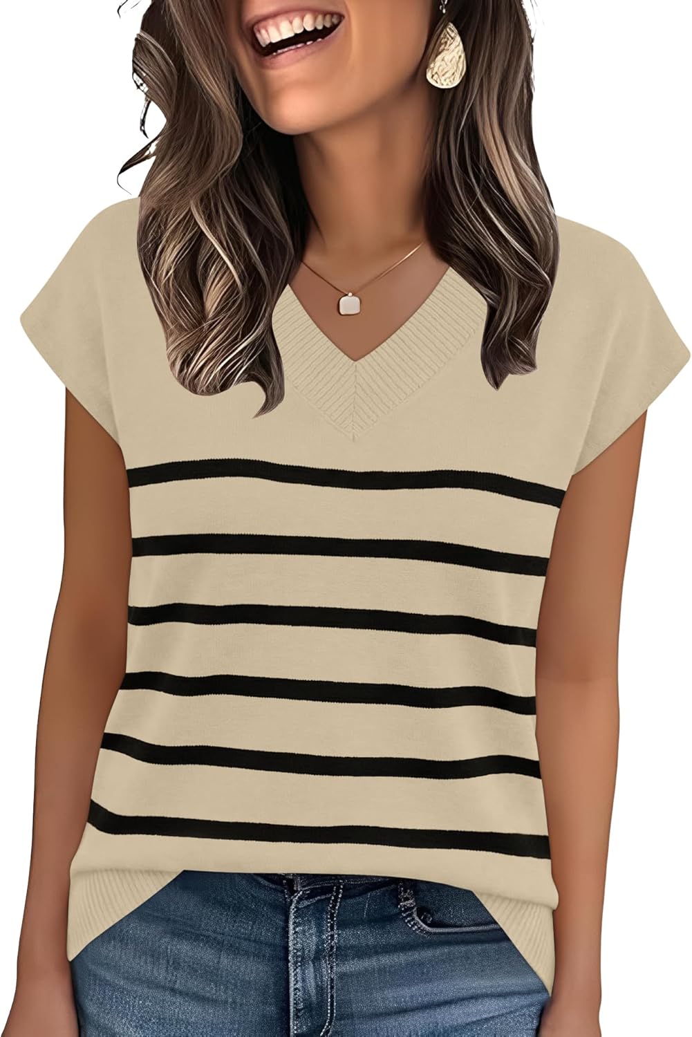 Rapbin Womens Summer V Neck Cap Sleeve Sweaters Knit Lightweight Casual Pullover Tops