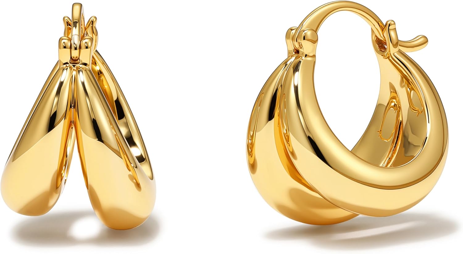 Chunky Gold Huggie Earrings for Women, 18K Gold Plated Double Hoop Earrings Split Hoops Earring Sterling Silver Post Statement Earring Jewelry Hypoallergenic Lightweight Hoops Gifts