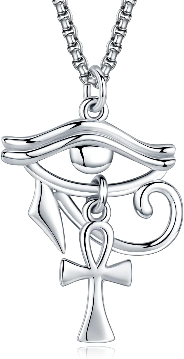 KINGWHYTE Eye of Horus Necklace 925 Sterling Silver Egyptian Ankh Cross Necklace Eye Protection Pendant Jewelry Gifts for Women Men with Stainless Steel Chain - 22+2 inch(60cm)