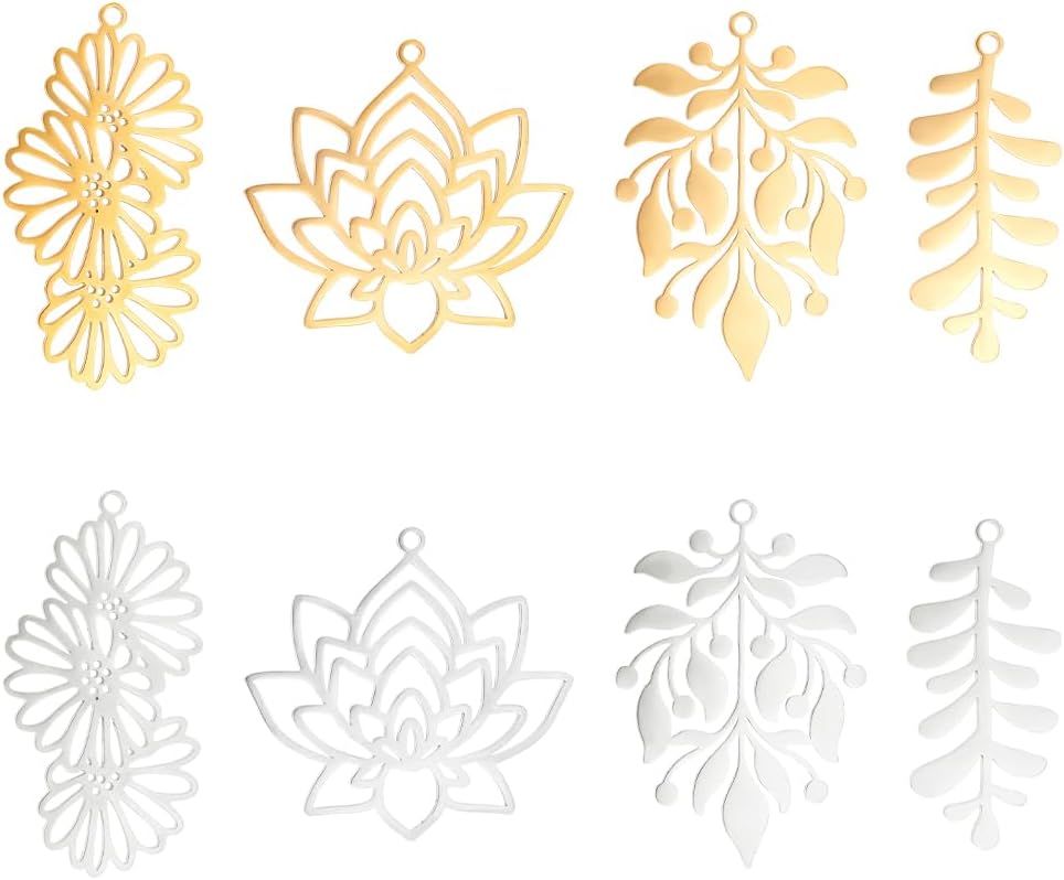 UNICRAFTALE 8pcs 4 Styles 2 Colors Hole 1.6mm 201 Stainless Steel Charms Metal Laser Cut Flat Hollow Lotus Leaf Flower Plant Pendants Drop Dangle Earrings Charms for DIY Necklace Jewelry Making