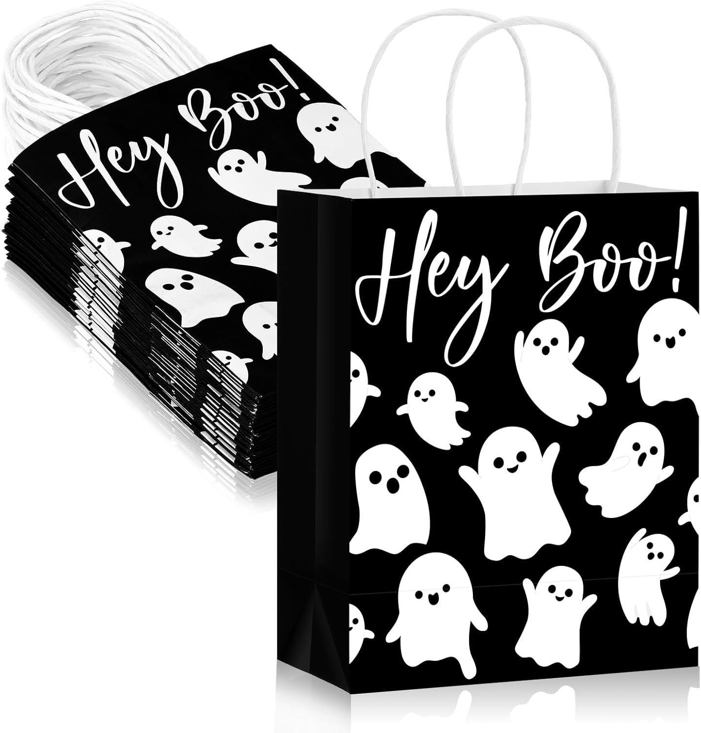 - Hey Boo Design: adding a whimsical touch to your Halloween party, our halloween gift bags feature a spooky little ghost image with the playful "hey boo" lettering; This distinct Halloween-themed design is sure to be a hit with your guests, creating a fun, spooky atmosphere; The black and white color not only matches any Halloween decor but also enhances the festive mood